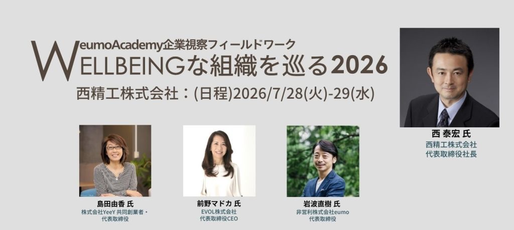 企業視察フィールドワーク2026〜Well-beingな組織巡り〜 今年も企業視察フィールドワークを開催します。 eumo AcademyのWell-beingな組織巡りフィールドワークでは、地域に根ざして地域とともに成…